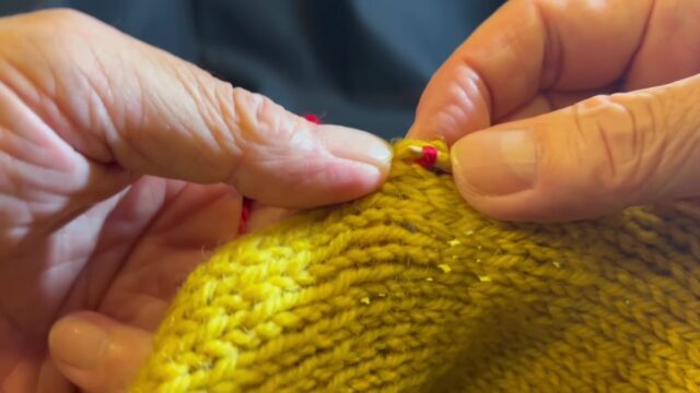 いよいよセーターの最後の作業です。身頃の袖ぐりに、袖を付けていきます。この作業は「引き抜き閉じ」と...