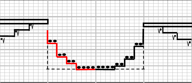 後ろ身頃と前見頃の袖ぐりの曲線部分の編み図ができましたので、次は前見頃の衿ぐり部分を編み図に落とし...