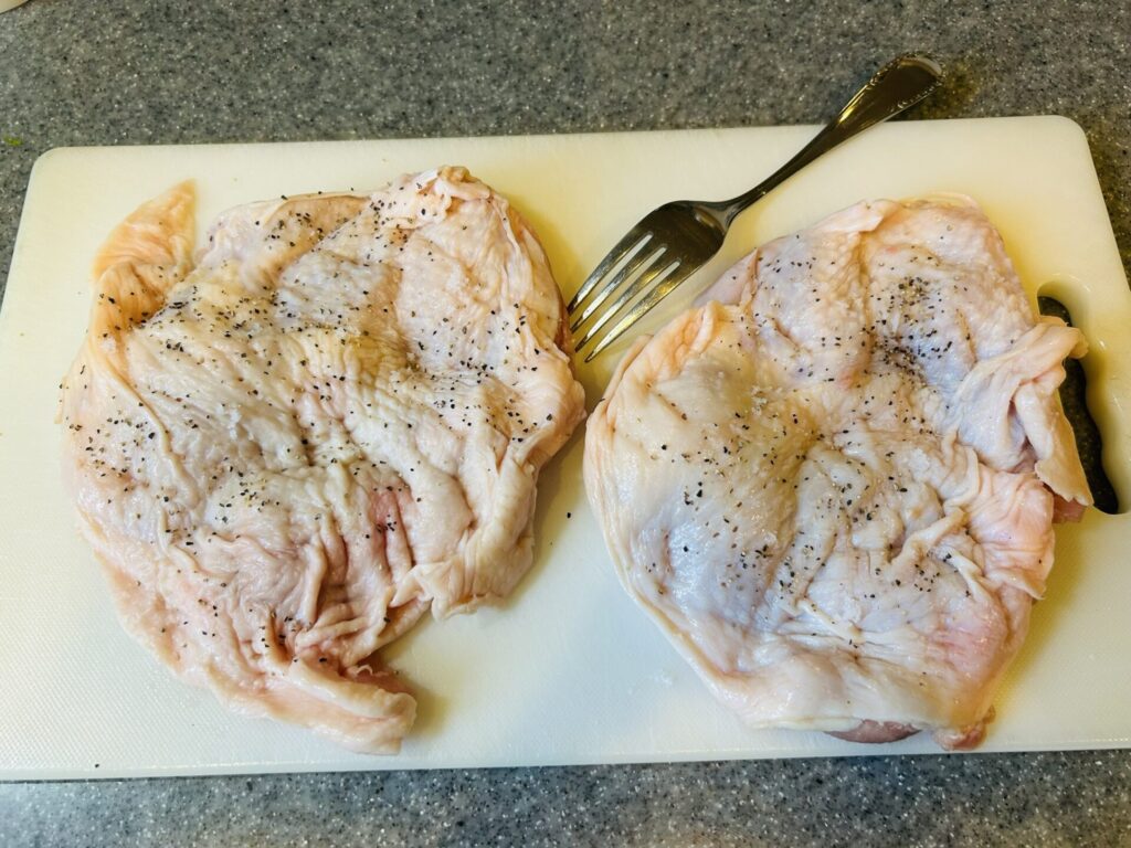 ② モモ肉は皮目にフォークで穴をあけ、塩コショウを両面にまぶしておきます。