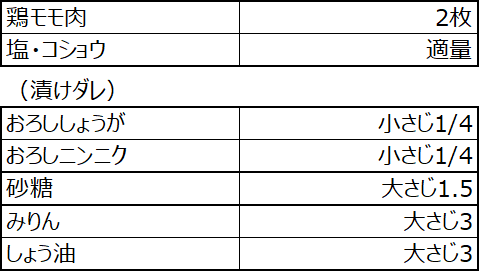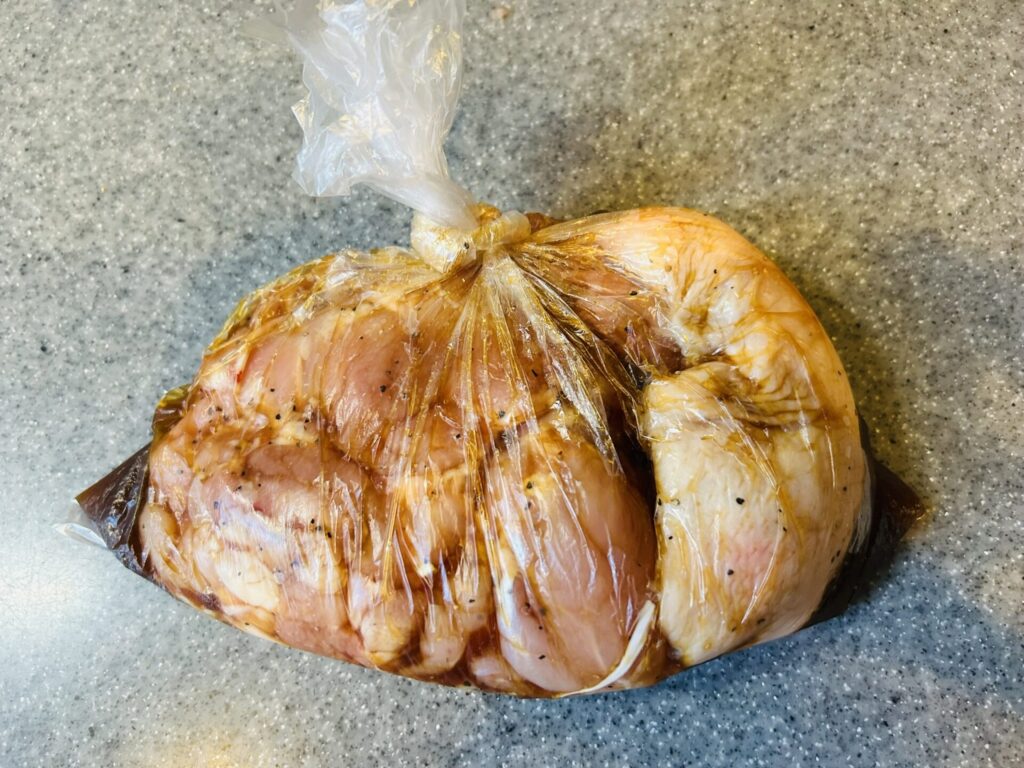 ③ ポリ袋に漬けダレを入れ、モモ肉を加えて揉み込んでから空気を抜いて口を閉じ、冷蔵庫で1時間程度寝かせます。