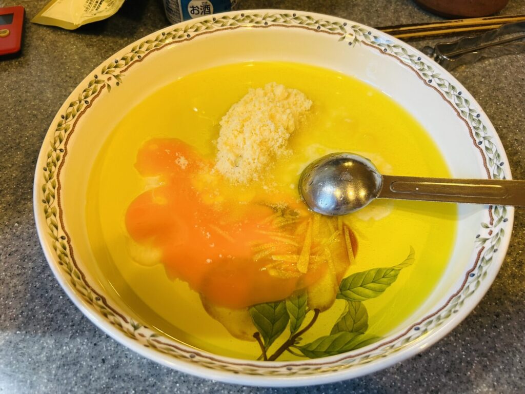 ① 卵黄と粉チーズとオリーブオイルを大皿に入れて混ぜ合わせます。