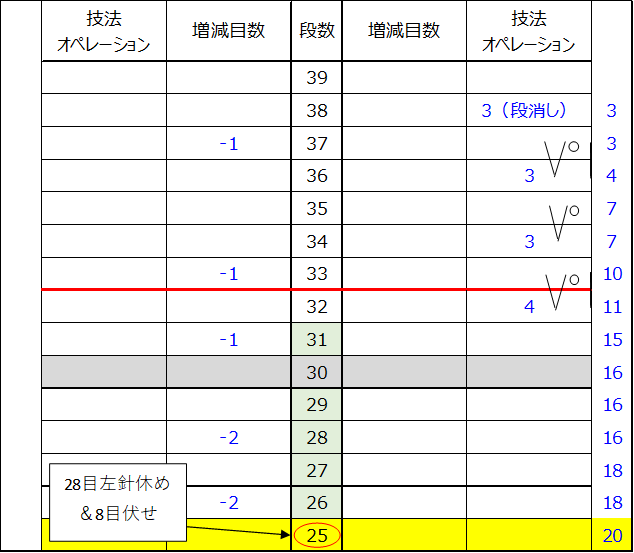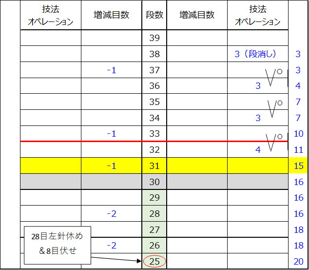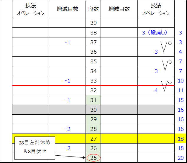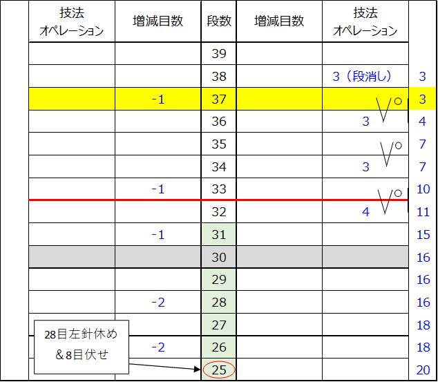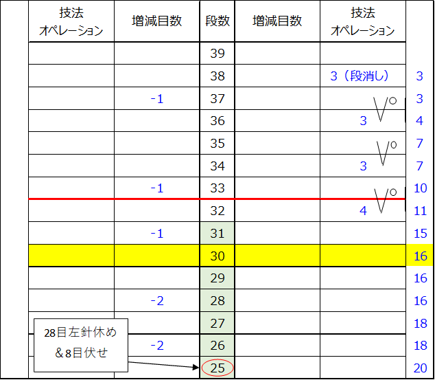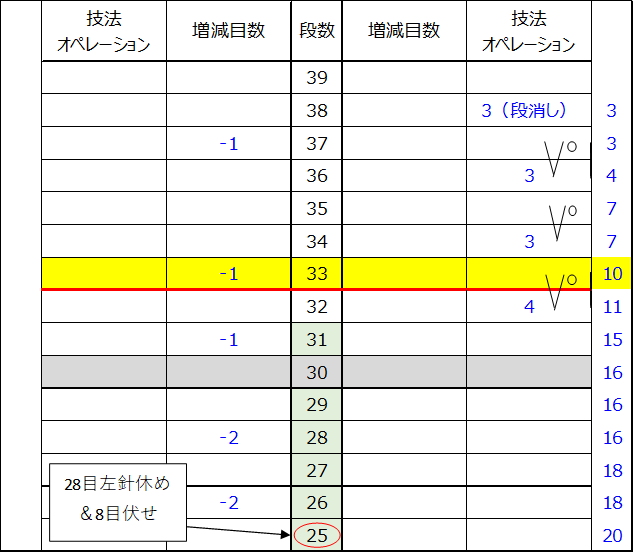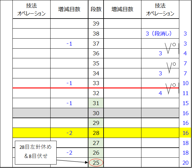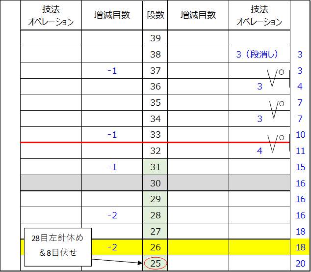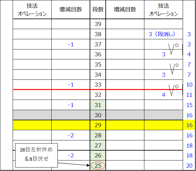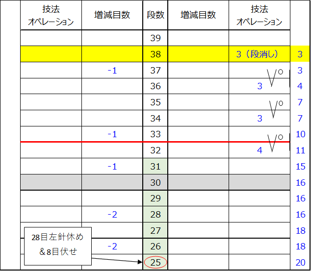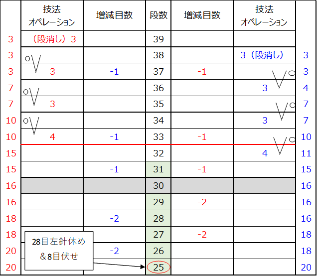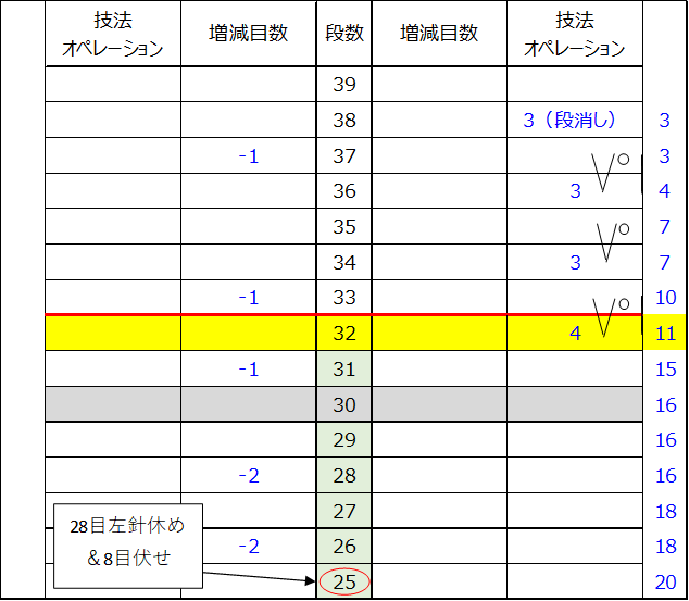 ここからは後ろ身頃の時と同じように、最後の「段消し」になります。
