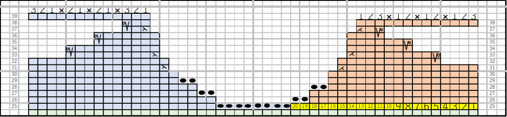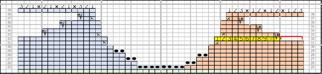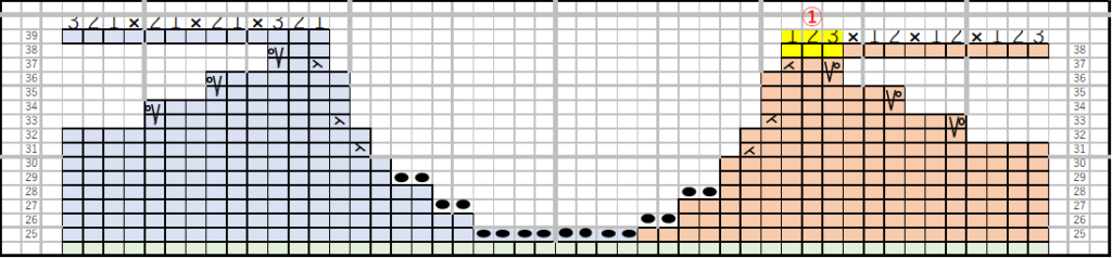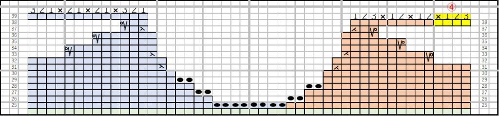 ここからは前身頃の向かって右側の衿ぐりと肩下がりを編んでいきます。下の編み図の「4」の部分になります。