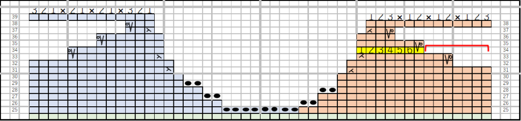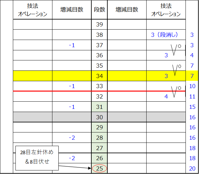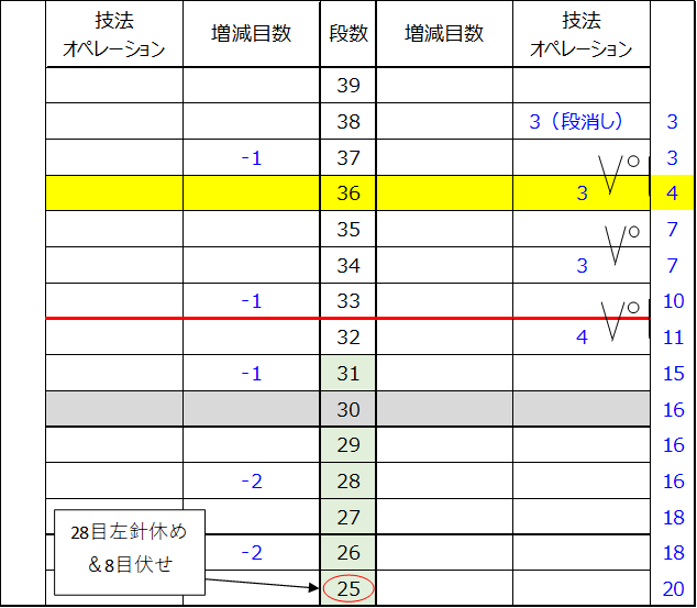 左針には、32段目で残した4目と合わせて、全部で7目残る事になります。