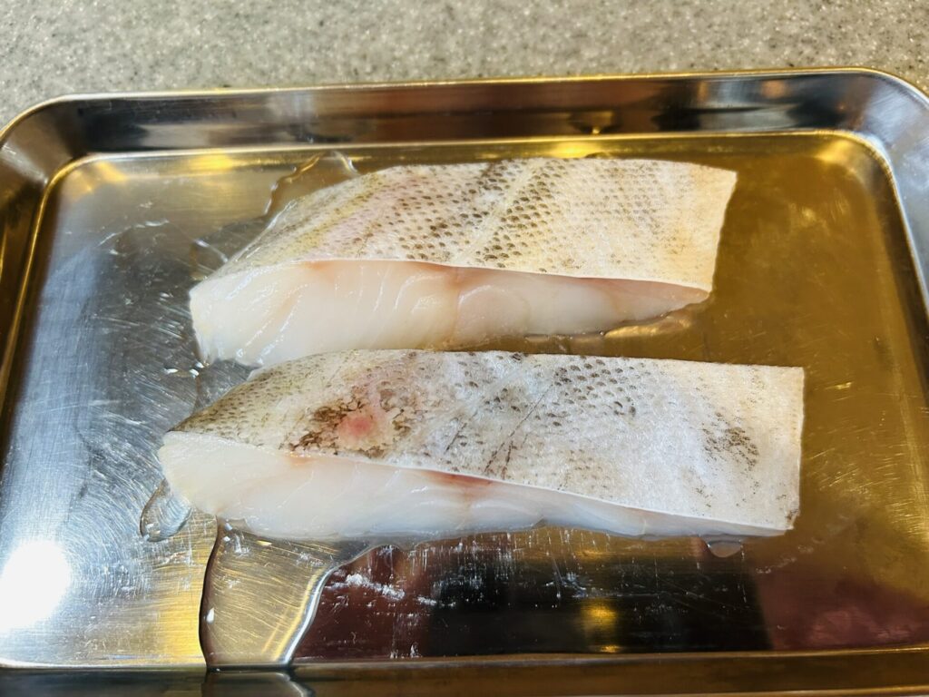 ① タラは塩と酒をふり、15分程度置いておきます。その後はキッチンペーパーで水分を取っておきます。