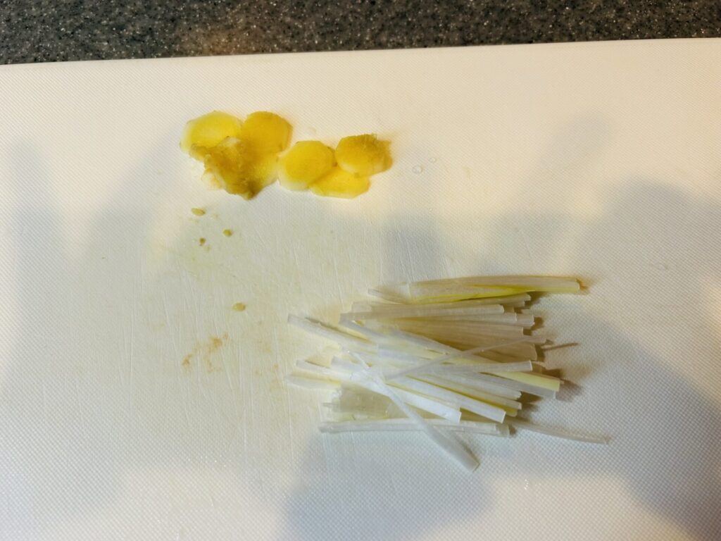 ② 生姜は薄切りに、長ネギは白髪ねぎにしておきます。