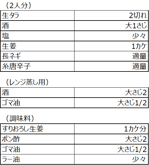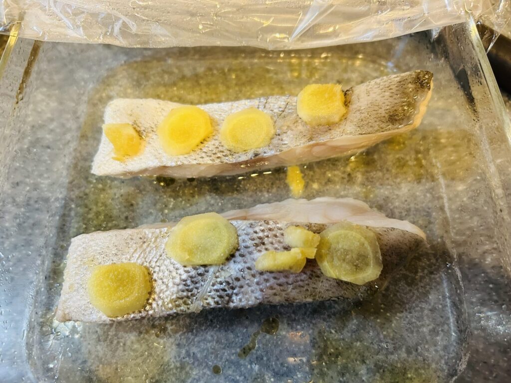 ④ 耐熱皿にタラを並べて薄切り生姜を乗せ、レンジ蒸し用の酒とゴマ油をふってふんわりとラップをかけて、600Wで3分レンジで加熱します。