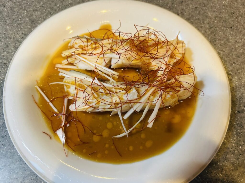 ⑤ タラをお皿に盛って混ぜ合わせておいた調味料をかけ、白髪ねぎと糸唐辛子を乗せたら出来上がり。