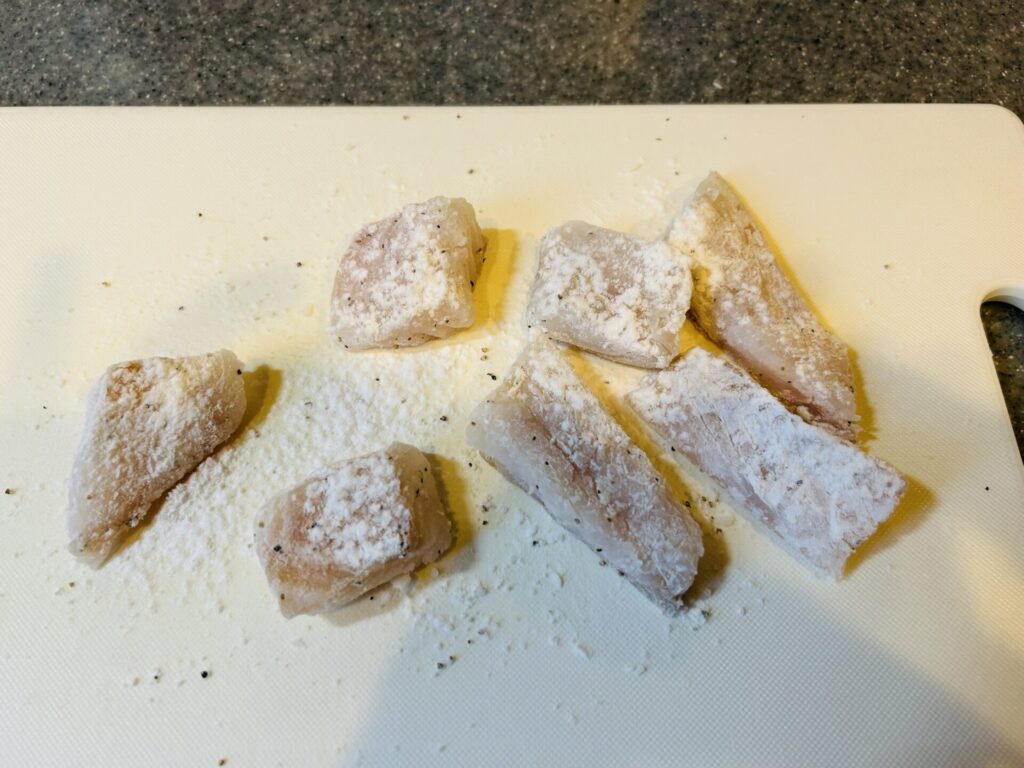 ③ タラは食べやすい大きさに切って塩・コショウをして、片栗粉をまぶしておきます。