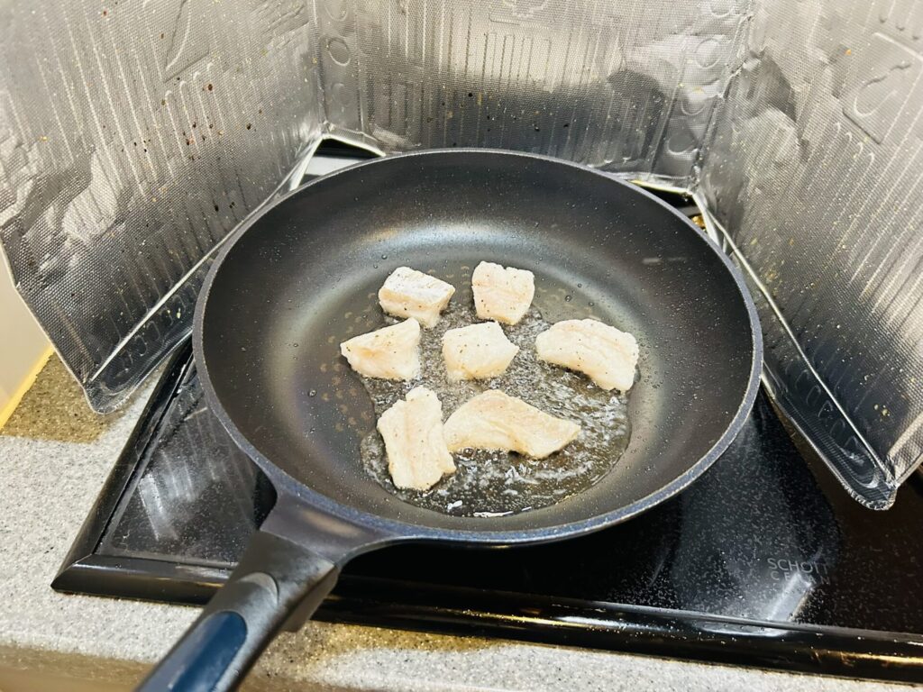 ④ フライパンに多めの油を敷いて、タラを揚げ焼きにして更に上げておきます。
