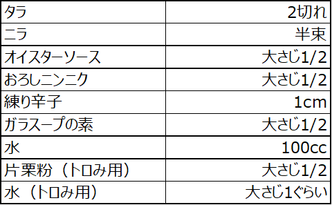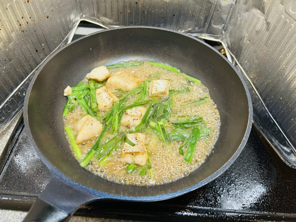 ⑤ ニラを炒めて火が通ったら揚げ焼きにしておいたタラと調味料を加え、煮立たせてからトロみ用の水溶き片栗粉を加えてトロみを付けます。