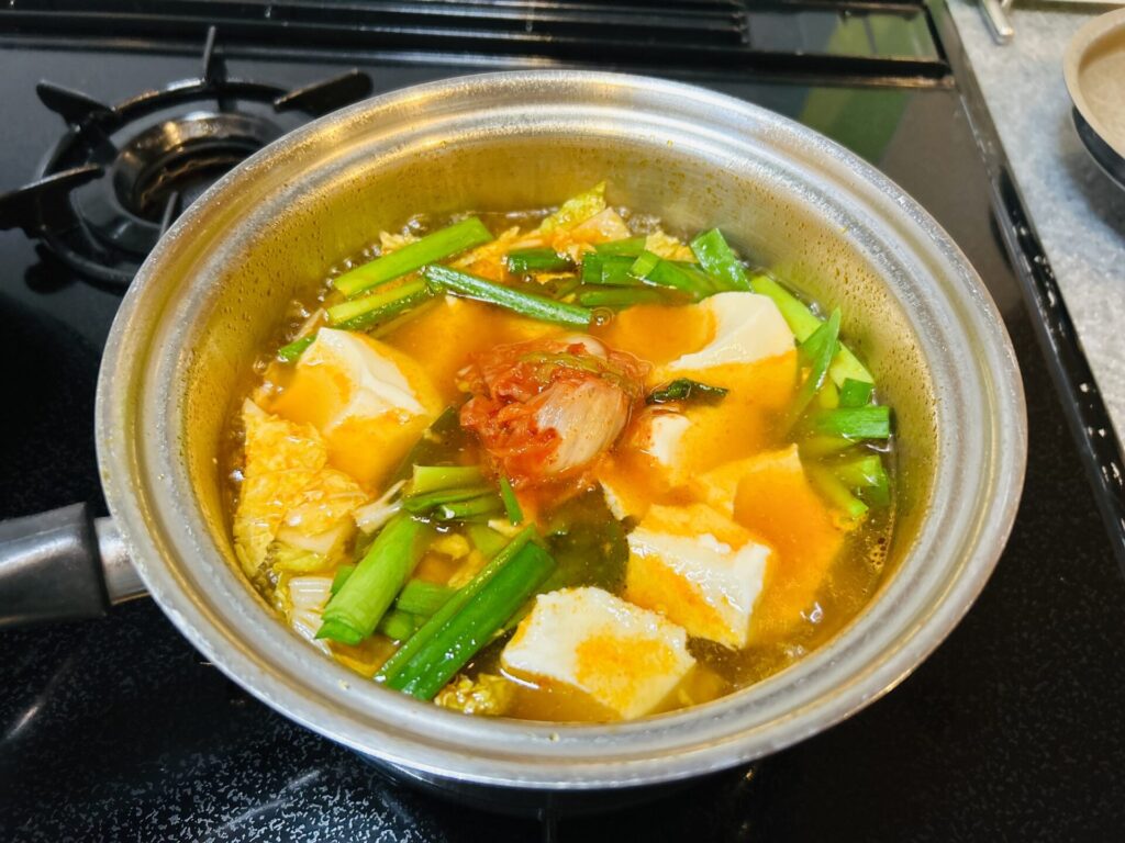 ② 好みの野菜類や豆腐等を用意して鍋に加えます。この日は豆腐を半丁分ぐらいとニラ半束、白菜少量とキムチを適当に入れました。