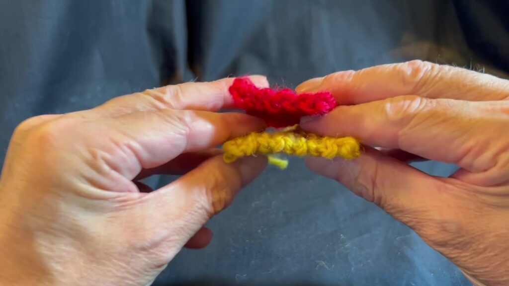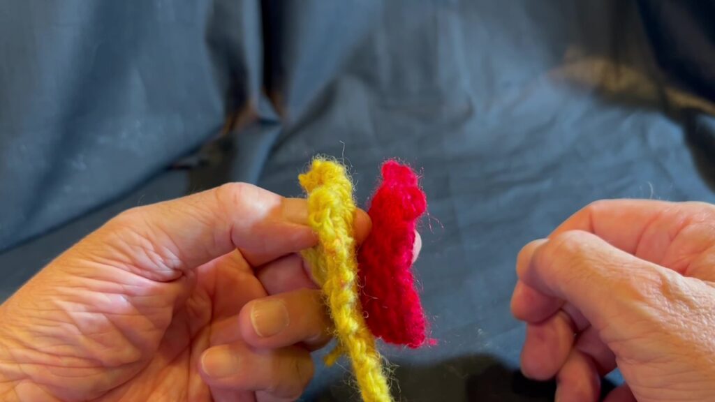 それぞれ閉じ方が異なりますが、閉じた後の形も若干異なります。黄色の毛糸は閉じ針を使って閉じたもので、赤い毛糸はJeny Staimanさん考案による方法で閉じたものです。