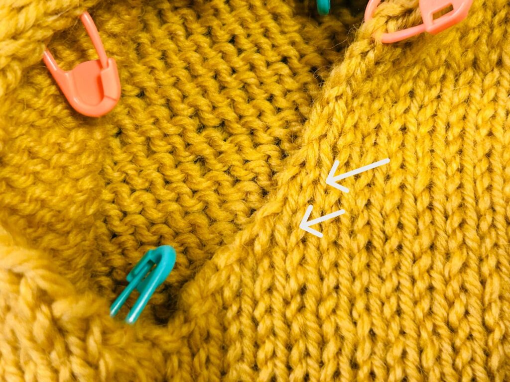 この衿ぐりもそれぞれの目の間隔を確認しながら、ずれていると思ったら戻って作業を進めてください。ここも最初まで戻ったとしても大した事はありませんので、気楽に拾い目をしてください。