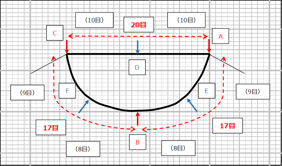 前の部分はまず中央にマーカーを付け(B点)、更にABの中間より少し中央りの部分(E点)とBCの中間より少し中央りの部分(F点)にマーカーを付けます。そして新しい針でA―Eで9目、E―Bで8目を拾い、更に新しい針でB―Fで8目、F―Cで9目を拾います。