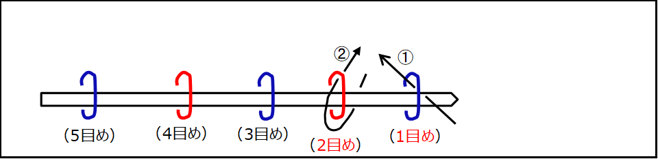 1目め(表目)と2目め(ウラ目)に糸を通す