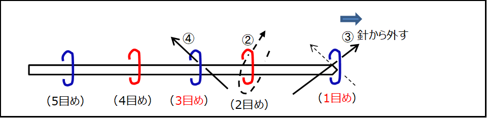 これ以降のウラ目は2目めと同じ作業が、表目は3目めと同じ作業が続きます。糸を掛ける方向はそれぞれ異なりますが、「掛けて、編んで、かぶせて、かぶせる」という作業を繰り返す事になります。