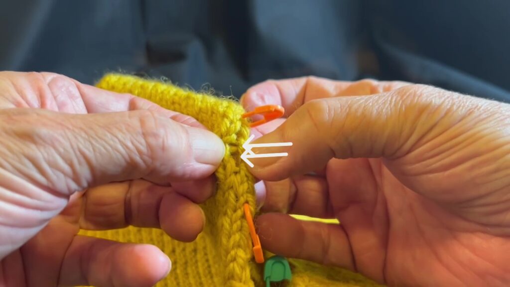 目を拾うのは写真にある通り、カーブの部分は端の目の隣の目(1目内側)から(ここは衿ぐりの時と同じです)、直線的になっている部分は端の目の隣の目(渡り糸が渡っているところ)から拾い目をします。