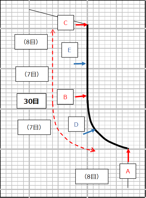 そしてA-D間で8目、D-B間で7目、B-E間で7目、E-C間で8目拾います。