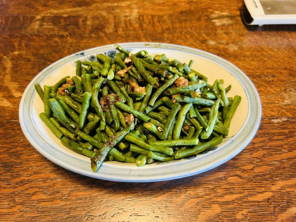私の母の本籍地は愛知県稲沢市で、数年ぶりでお墓参りのために行った時に、親戚の家で出してくれました。子供の頃は野菜の煮物とかお浸しとかはあまり好きではありませんでしたが、なぜかこの「ささげ」のお浸しは好きで、子供の頃からバクバク食べていました。久しぶりのいなかの味を堪能しました。