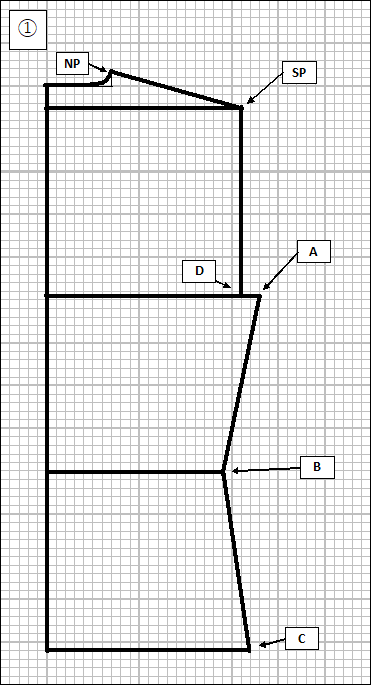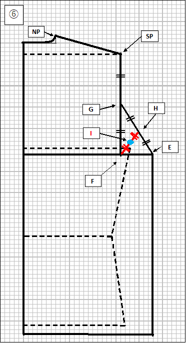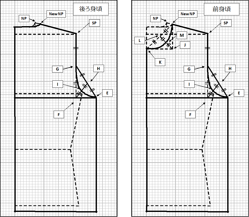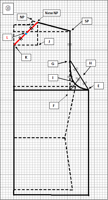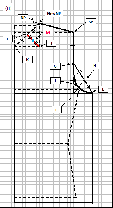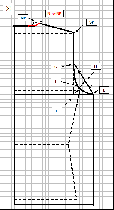⑧ 次は衿部分を修正します。NP-SP線上で、ネックポイント(NP)を2cm後ろ方向に移動させ、New NPとします(従前のNPより、約5mm高さが低くなります)。New NPからN(首回り)線に向かって2cm程度なだらかなカーブを描きます。