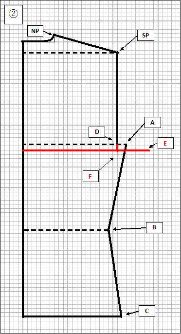 ③ H(腰囲)線もB(胸囲)線と同様に補正して、(このセーターの場合には)H(腰囲)線の2cm下に補正したB(胸囲)線と同じ長さ(28cm)の横線を描いて、左側部分も補正した上で、右端と上記E点も結びます。