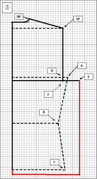 そしてSP-D線を補正したBラインまで伸ばします。この交点をF点とします(SP-F:23.5cm)。