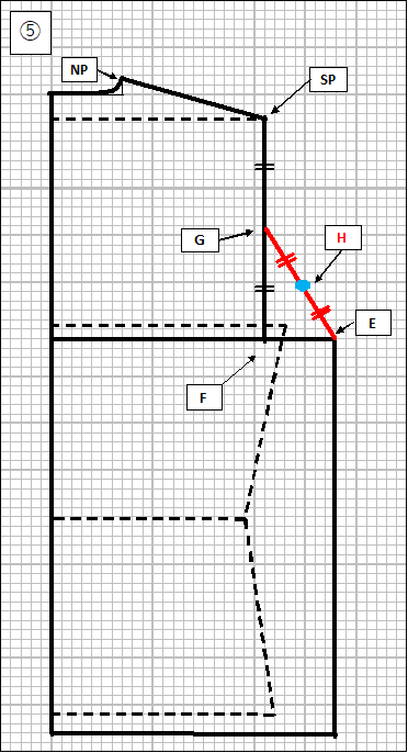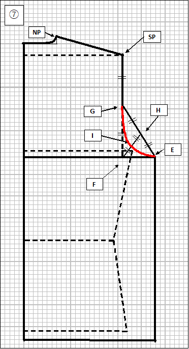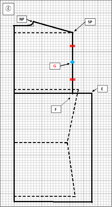 ④ ここから袖ぐりのカーブを描きます。SP-Fの中央をG点とします。