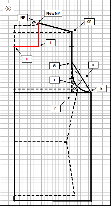 ⑨ ここからは、同じ図面でこのまま前見頃の衿の部分を描きます。New NPから下に向けて、当初の首回り(N)の1/6の長さ7cm(=41cm÷6=6.83cm)を2cm後退させた分(9cm=7cm+2cm)だけ直線を引きます(この終点をJ点とします)。