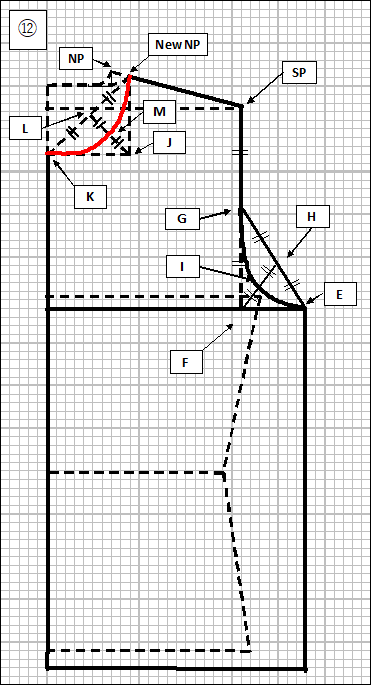 ⑫ New NP点から、M点を通ってK点までのなだらかなカーブを描きます。この曲線が前見頃の「衿ぐり」となります。