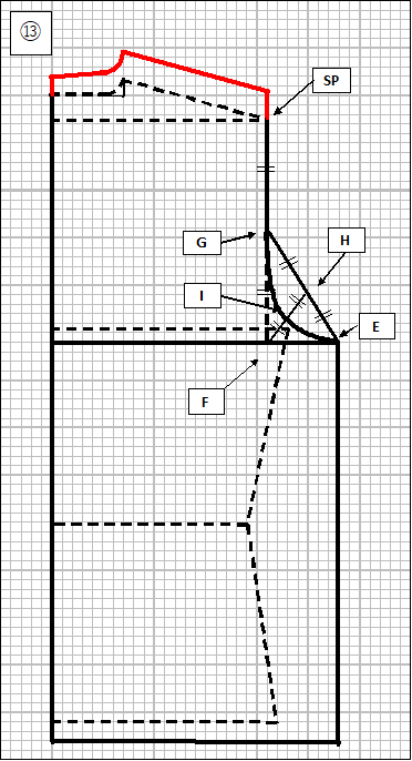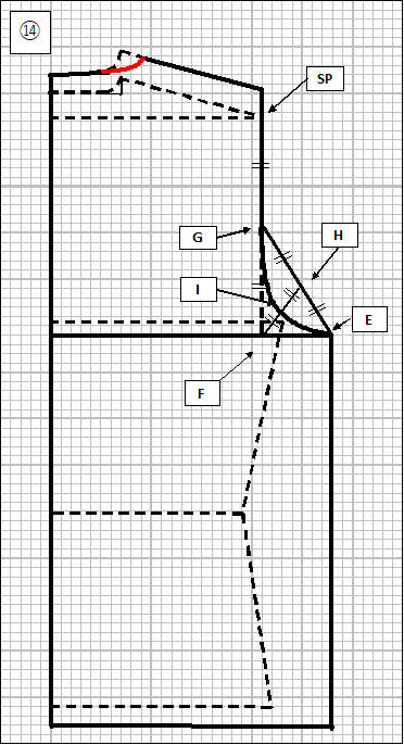 ⑬ 背中や肩の厚みを調整するためには、後ろ見頃について衿下がりとNPとSPの位置を数センチ前見頃より高くします。この例では、衿下がり部分を2cm、NPを3cm、SPを3cm高くしています。