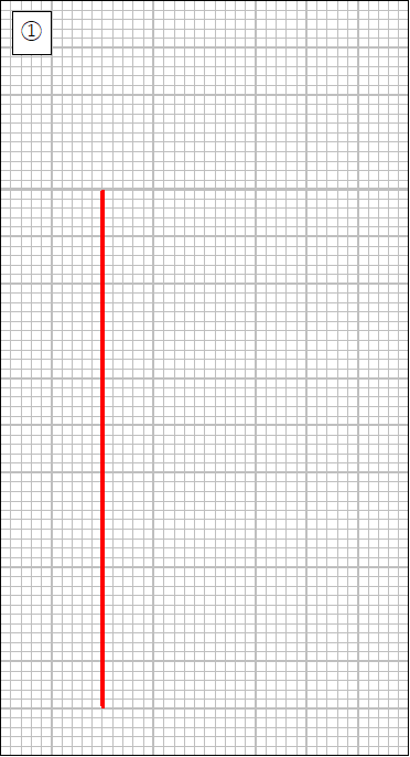 ① 袖丈(55cm)の中心線を垂直線で引きます(袖部分は半分だけ図面にして、編む時にはそれを全体に展開して編むことになります)。