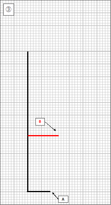 ③ 袖丈線の一番上から33cmのところ(ひじ丈=袖丈55cm×3/5=33cm)で、右方向に向かってひじ回りの半分(12cm=24cm÷2)だけ線を引きます(右端をB点とします)。