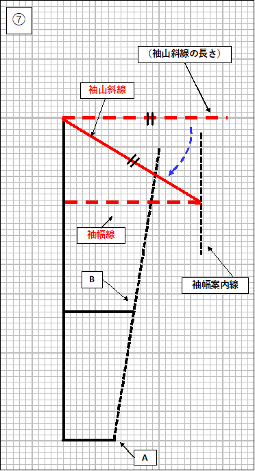 ② 袖山斜線の「長さ」は、「(後ろAH+前AH)÷2」の長さとなる事。