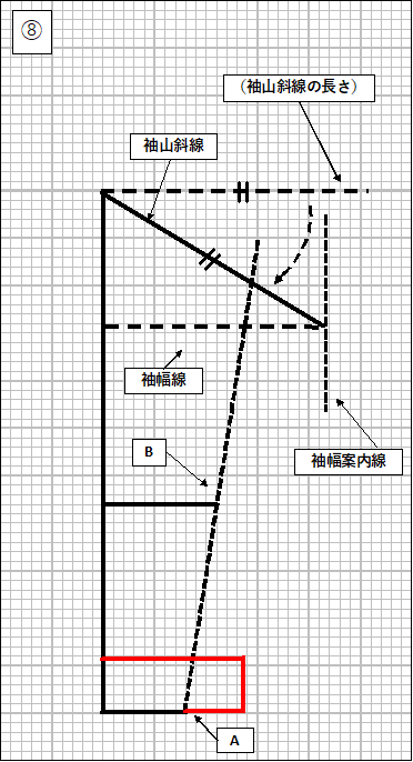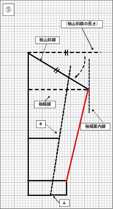 ⑨ 袖口の右上と袖幅線の右端を結び、袖口から脇下までの袖幅線とします。