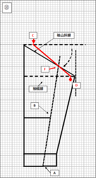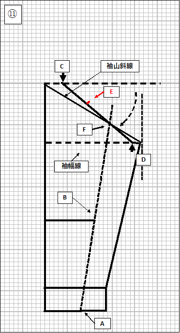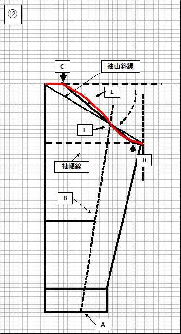 ⑫ 袖丈線の頂点とC点を結び、C点からE点を通ってF点まで自然なカーブを描き、F点から袖幅線の右端に向かって、袖山斜線の下側にふくらみを持たせる自然なカーブを描きます。