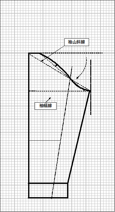 ① 袖山斜線の「傾斜」を決めるために、袖幅の案内線を引いておく事。