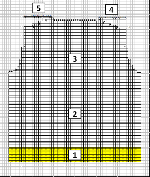 まずは後ろ身頃の裾部分からご説明させていただきます。下の編み図の「1」の部分の編み初めのご説明になります。