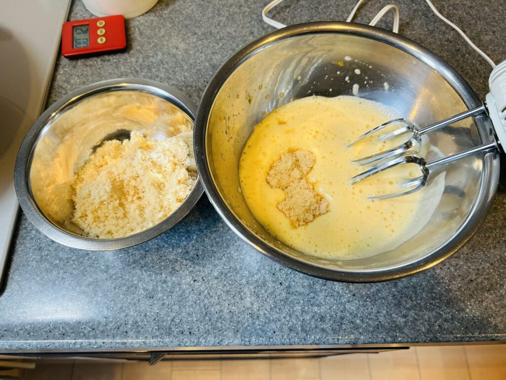 ③ ボウルにボウルに卵を入れて、少しもったり感が出るまでハンドミキサーで良く泡立てます(5分ぐらい)。