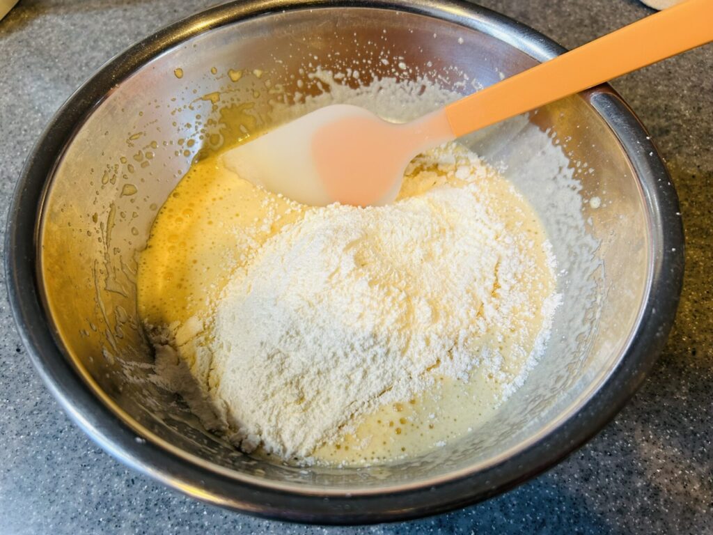 ⑤ 振るった薄力粉を加えて、粉っぽさがなくなるまでゴムベラで切るように混ぜます。