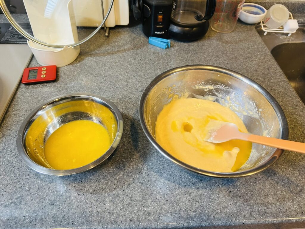 ⑥ 湯せんして溶かしたマーガリン3回に分けて加え、都度ゴムベラでつやが出てくるまで混ぜます。